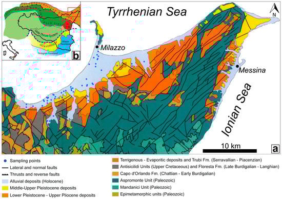 (a) Geological structure map of the easternmost part of Sicily (modified from [13]). On the map, the locations of the sampling points are shown (blue dots). (b) Main structural elements of the Sicilian Chain–Foredeep–Foreland System (modified from [7]).