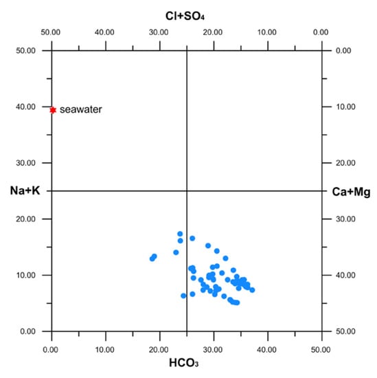 Langelier-Ludwig diagram [24] reporting the chemical data of groundwater (blue circles). The composition of Mediterranean seawater is also given for comparison.