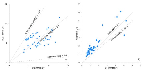 Scatter plots correlating the molar abundances of cation and anion species (data expressed in mmol L−1) in groundwater from the studied area, as (a) Ca vs. HCO3, and (b) Cl vs. Na. The grey lines represent the prevalent soluble mineralogical phases; the dashed line represents the seawater ratio.