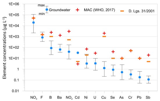 On the contrary, the concentrations of minor and trace elements above the MACs were found for NO3 (3 samples), F (3 samples), and Ni (1 sample) (Figure 4). Other elements not exceeding the related MACs but showing concentrations significantly higher than the backgrounds evidenced in Figure 5 are As, B, Ba, Cr, Cu, and U.