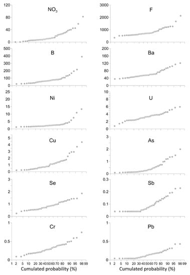 Minor and trace element concentrations range from 0.05 μg L−1 for elements like Sb and Pb up to 110 mg L−1 for NO3 (Table 1). Their distribution in groundwater is summarized in Figure 4 and compared to the Maximum Admitted Concentrations (MACs) indicated by the WHO [25] and the Italian National Legislative Decree (D. Lgs.) 31/2001 [26]. Probability plots (Figure 5) were drafted in order to discriminate the background values and different families of data. The probability plots express the probability of cumulative frequencies of the measured concentrations of each trace element. In these plots, each log-normal population of data shows as a straight line, whereas an inflection point divides two populations [27].