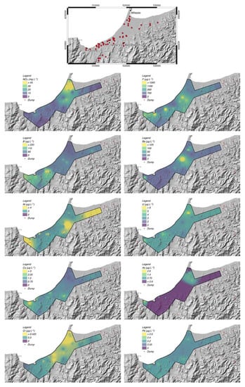Based on the results of the probability plots, we mapped the spatial distribution of concentrations of selected chemicals in function of the inflection points on the probability plot curves—the results are shown in Figure 6. We only mapped chemicals showing spatial anomalies emerging from the background, thus excluding all those uniformly distributed. The distribution of concentrations exhibits a general spatial coherence, with relative high concentration areas often coinciding for different chemical species and, in particular, moving from SW to NE: i) the south of the city of Falcone; ii) the Terme Vigliatore area; iii) and the Milazzo Plain.