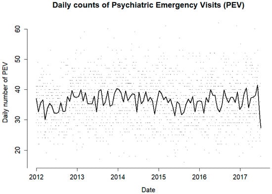 Daily number of individuals visiting the psychiatric emergency room (PEVs) for the duration of the study period (points) and its moving average (line).