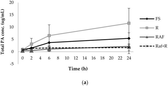 It is important to note that our findings did not confirm whether the impact of fibres on PA production was inhibitory or just retardation. The total sum of PA showed a linear increase suggesting that the final total amount could have been much higher if more time were available. As demonstrated by Pérez-Jiménez, Serrano [], the release of antioxidants associated with dietary fibre was delayed.