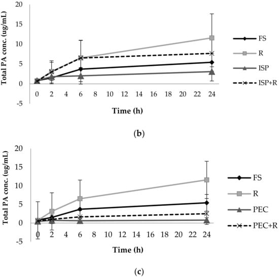 Impact of raftiline (a), ispaghula (b), and pectin (c) on total phenolic acid (PA) production from rutin incubation with human faecal bacteria. The inhibitory impact of raftiline, ispaghula, and pectin across time are demonstrated as mean (± SD). FS: Faecal slurry, R: Rutin, RAF: Raftiline, RR: Raftiline + Rutin, ISP: Ispaghulla, ISP+R: Ispaghula + Rutin, Pec: Pectin, PEC+R: Pectin + Rutin. Rutin and FS only incubations were matched for all groups.