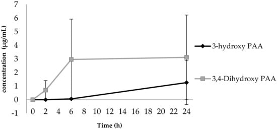 All incubation combinations demonstrated an increase in 3,4-diOHPAA concentration up to 6 h up to 3.1 ± 4.2 µg/mL and plateaued thereafter. There was no production of 3-OHPAA up to 6 h and an increase in concentration up to 1.2 ± 1.6 µg/mL thereafter (Figure 2).