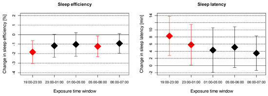 Figure 1. Association between measured outdoor noise exposure (Leq) at different time windows during night and changes in all-night sleep efficiency and sleep latency per 10 dB(A) increase in noise exposure. Significant associations are highlighted in red. Analyses adjusted for age, sex, education, evening caffeine intake, evening alcohol consumption, evening screen time, day of the week, season, and whether woken up by an alarm clock.