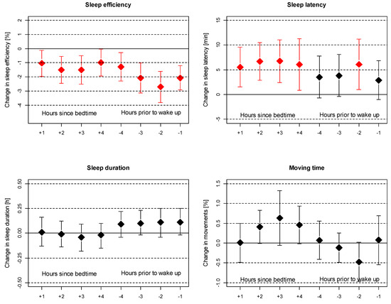 Exposure within fixed time periods (as shown above) may not match the individual time period a person is asleep or in bed. For instance, for somebody rising before 06:00, noise exposure between 06:00 and 07:00 is not relevant regarding sleep disturbance. We thus calculated hourly noise exposure levels that matched the individual sleeping pattern of each night for the first four and the last four hours of sleep. The corresponding analyses with all actimetry-derived sleep outcomes are shown in Figure 2. This individualized noise exposure provided stronger associations between measured noise exposure and sleep efficiency. Sleep latency increased by five to seven minutes per 10 dB(A) increase in outdoor noise exposure during the first four hours after bedtime. For sleep efficiency, noise exposure during the last three hours prior to wake-up was most critical, with reductions of 2%–3% per 10 dB(A) increase in measured outdoor noise exposure (Leq,1h). For sleep duration and moving time, no significant associations were found, although noise exposure two to four hours after bedtime tended to increase moving time during sleep, and noise exposure two hours before wake-up tended to be negatively associated with moving time.