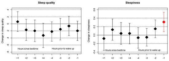 Self-reported sleepiness in the morning was significantly associated with noise exposure in the last hour of sleep, whereas no associations were observed for noise exposure at the beginning of sleep (Figure 3). For self-reported sleep quality, none of the noise exposure time windows were significantly associated, but noise exposure in the middle of the sleeping period (±4 h from bedtime and wake-up) and at the end of the sleeping period showed the strongest trends for a relation. For IR matched to individualized sleep patterns, no significant effects on actimetry-derived and self-reported sleep outcomes were observed.