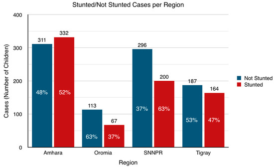There is evidence to suggest that the variance in stunting prevalence is significant across regions (Pearson chi-square p < 0.0001). This suggests that socioeconomic, environmental, and nutritional factors vary from one region to another, and that there is a correlation between region and stunting rate in this context. Oromiya shows evidence of lower proportions of children under five who are stunted, as compared with the other regions. SNNPR contains higher proportions of children who are stunted.
