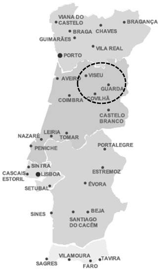 Map of Portugal showing the location of Viseu and Covilhã.