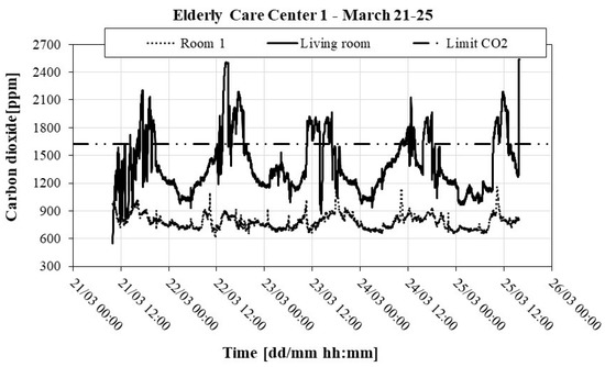 Recording of CO2 in room 1 and the living room of ECC 1: 2nd trial (21 to 25 March).