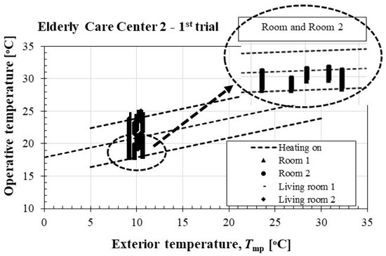 The thermal comfort of rooms 1 and 2 and living rooms 1 and 2 of ECC 2 was assessed using the adaptive model proposed by LNEC [28], as shown in Figure 3.