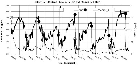 Figure 5 and Figure 6 show the temporal evolution of CO2 and TVOC. The initial points of the CO2 decay method are shown; they were used to determine the ACH through the decay technique. Points with maximum levels of TVOC are also shown.