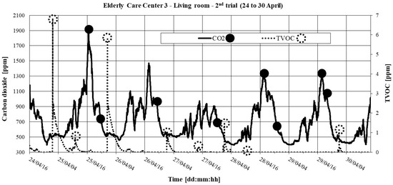 CO2 and TVOC in the living room in ECC 3: 2nd trial (24 to 30 April).