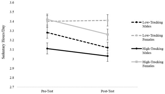 p < 0.01), demonstrating that the relationships were different between the boys and the girls. Closer examination revealed that there were significant declines in sedentary screen time behavior for boys and girls in the high self-monitoring group, as well as for boys in the low self-monitoring group, but not for girls in the low self-monitoring group (see