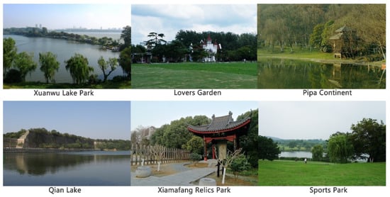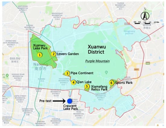 Xuanwu District parks. Within the Xuanwu District, all six urban parks with free admission and good transport accessibility (shown in Figure 1) were included in the data collection phase of the study: 1) Xuanwu Lake Park, 2) Lovers Garden, 3) Pipa Continent, 4) Qian Lake, 5) Xiamafang Relics Park, and 6) Sports Park. A few other parks exist on Purple Mountain, but some are reserved for resource conservation, while the rest either charge an admission fee or are located far from residential areas.