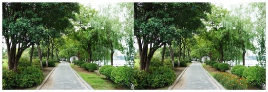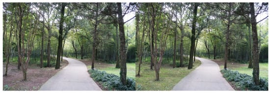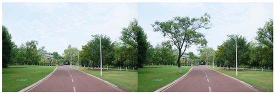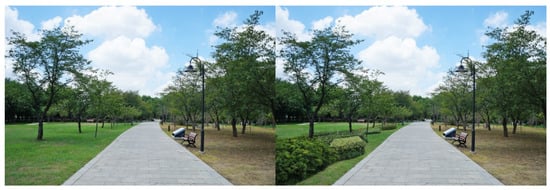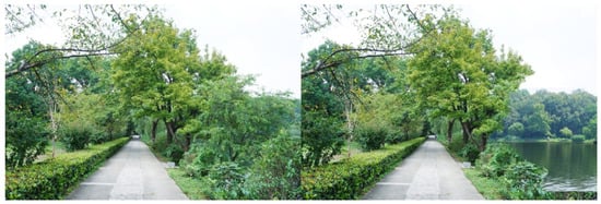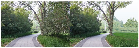 For each tested feature, four pairs of photos were produced to make comparisons. Half of the original photos were modified by adding the landscape features, and the other half by removing the features. As there were seven features tested in this study, a total of 28 pairs of images were produced. Both researchers carefully examined the final photos, to make sure the differences of the paired photos could be easily recognized, but the digital revision artifacts would not be obvious to viewers. The photo booklets used by all study participants included the same set of 28 paired images, shown in Appendix A, Table A1. Figure 3, Figure 4, Figure 5, Figure 6, Figure 7, Figure 8 and Figure 9 show seven pairs of images, each presenting a single example of each of the seven features tested. To make it easier for readers, all figures in this paper are arranged to show the hypothetically-preferred image at the right side.