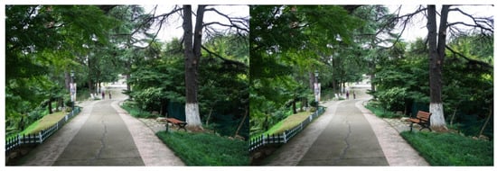 All 31 urban parks included in the high-density areas of Nanjing were visited, and more than 600 photographs were taken between August and October 2017. The type and location of photos depended on scenic qualities and the landscape features to be tested. Most photographs were taken when standing in the middle of the walkway—the pavement was placed in the center and with the green space along the walkway on both sides, providing a balanced view and an immersive experience of taking a walk. In order to capture more detail and minimize strong shadows, photos were typically taken in overcast weather with soft, low-light conditions. In addition to photos of walkways, other landscape photos were also taken in the urban parks, as materials and textures for photo editing purposes.