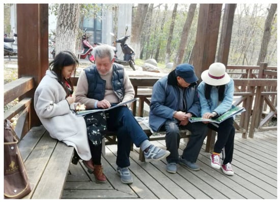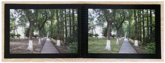 Before the data collection phase began, the preliminary instrument (printed color booklet) was pre-tested at a nearby park not included in the study (see Figure 1), in order to verify the preferred booklet format, test the field protocol, and ascertain whether any images needed adjustment. The older adults participating in the pre-test seemed to easily be able to select the photos they preferred. Based on participants’ comments, a few improvements were made in the prepared booklet. Most participants preferred the booklets in side-by-side format (Figure 10) rather than one above another, saying they were more convenient and easier to use. Some said the plastic covers of the booklets were slippery to hold or put on their lap, so we added rough paperboards over the covers. In addition to overall quality control, a few revisions were made to individual images. In one original photo, a large blue tree label was hanging in the tree, which distracted participants’ attention from other landscape features. The blue label was removed from the photographs, as it was not a common or necessary element in urban park walkways. In another photo, the added shrubs were slightly dark and difficult to see, so the plants were brightened. Data from the pre-test was not included in the main study.