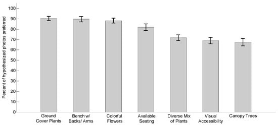Paired t-tests were used to determine whether subjects preferred to use certain walkway features more than others. Table 3 compares the differences between preference measures of different features. The subjects especially preferred walkway features such as “Ground cover plants” (90.37%), “Bench with backs and arms” (89.66%), and “Colorful flowers” (88.25%), more than the other four features (p ≤ 0.001). It is worth noting that “Bench with backs and arms” was more highly preferred than “Available seating” (p < 0.001) by older adults. The feature “Available seating” (81.89%) was more preferred than the features including “Diverse mix of plants” (71.82%), followed by “Visual accessibility” (68.99%), and “Canopy trees” (67.40%).