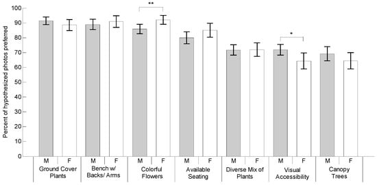 The age and gender of the participants were manually entered in Excel worksheets, along with their survey responses. The measure for landscape features older adults preferred to use was calculated as the percentage of the example pairs where the hypothesized photo was selected, taking on possible values of 0%, 25%, 50%, 75%, or 100%. It is worth noting that unlike Likert-type measures of preference, these scales were of ratio/numeric status. A one-sample t-test was used to determine the preference of each landscape characteristic and the feature examples. Paired t-tests were conducted in analyzing the differences between environmental features. An independent samples test was used to analyze the differences between the genders. The relationship between features and age was calculated by Spearman correlation. The level of significance was set at p < 0.05. The statistical analysis was completed in IBM SPSS Statistics 19 (SPSS Inc., Chicago, IL, USA).