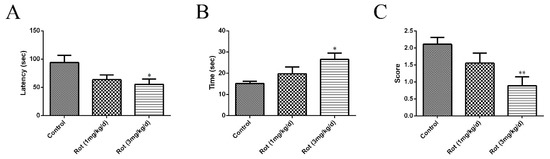 Rotenone caused dose-dependent changes in behavioral tests in mice: 1 mg/kg/d or 3 mg/kg/d of rotenone (dissolved in normal saline with 2% DMSO) was applied to ICR mice through intraperitoneal injection for 21 consecutive days to establish a Parkinson’s disease (PD) model. Normal saline with 2% DMSO was used in the control group. (A) The time of latency in falling was recorded after the last injection of rotenone. (B) The total time for each mouse to orient downward and descend to the floor was recorded. (C) The score of the traction test was assessed in each group. Data are represented as the mean ± SEM (n = 10); * p < 0.05 and ** p < 0.01 versus control group.