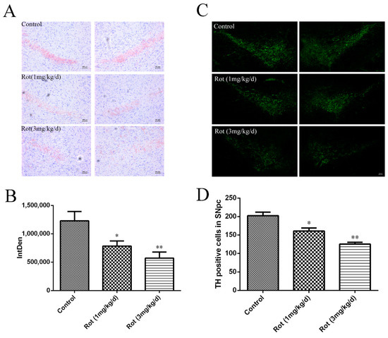 To observe the effects of rotenone on neuronal loss in the SNpc, Nissl staining was performed, and the images are shown in Figure 2A. Compared to the control group, the cell density in the SNpc decreased in the 1-mg/kg/d rotenone group (p < 0.05) and the 3-mg/kg/d rotenone group (p < 0.01) (Figure 2B). Additionally, we detected TH-positive neurons in the SNpc after rotenone injection. The images showed that both a low dose and high dose of rotenone could decrease TH-positive cells in the SNpc (p < 0.05 or p < 0.01), which was consistent with the Nissl staining analysis (Figure 2C,D). These data suggest that rotenone could induce neuronal loss in the SNpc, which might have been responsible for the deficits in motor functions observed in the behavioral tests.