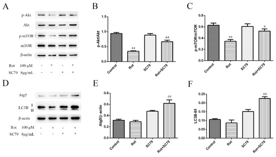 Western bolt validation of inactivated Akt/mTOR signaling and autophagy-related proteins in rotenone-injured SH-SY5Y cells. (A) SH-SY5Y cells were incubated with rotenone for 30 min, and then both phosphorylated and total Akt and mTOR were detected by western blot analysis. Here, 8 μg/mL SC79 was applied to activate the Akt pathway, and β-actin served as the internal control. (B,C) A quantification of phosphorylated protein expressions, measured in Panel A. Data are expressed as the ratio of phosphorylated proteins to total proteins. ** p < 0.01 versus control group; # p < 0.05, ## p < 0.01 versus rotenone group (n = 3). (D) The protein expression of Atg5 and LC-3B in rotenone-injured SH-SY5Y cells was examined by western blot. (E) A quantification of Atg5 expression. The data are expressed as the ratio of Atg5 to β-actin. ## p < 0.01 versus rotenone group (n = 3). (F) A quantification of LC3B expression. The data are expressed as the ratio of LC3B-II to LC3B-I. ## p < 0.01 versus rotenone group (n = 3).