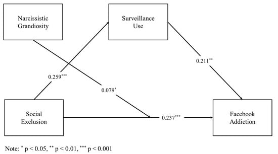 The present study has several limitations that may serve as directions for future research. First, this research did not distinguish among the types of social exclusion and relationships (e.g., romantic partners, co-workers, colleagues, and virtual friends) on Facebook. The typical Facebook friends recalled in the survey comprised heterogeneous groups that differed in the strength of their ties, intimacy, and emotional bonding []. Distinguishing these friend groups can produce different results. For example, information processing differs according to whether the social exclusion is caused by collective rejection or dyadic rejection []. This distinction could also influence Facebook addiction, so it would be meaningful to distinguish the types of rejection that cause social exclusion. In addition, the intensity of the relationships between romantic partners, coworkers and virtual friends differed. For example, according to the relationship type, social exclusion may result in different anti-social behaviors. Offensive behavior due to social exclusion is more frequent in easily replaced relationships than close relationships []. For example, in the case of strong ties (e.g., romantic partners) facing increased relational uncertainty, surveillance can be pursued as negative maintenance of romantic partnerships []. Meanwhile, the weak ties among some acquaintances (e.g., work colleagues) may benefit more from direct interactions. Thus, under weak ties, Facebook surveillance in social exclusion can be intensified []. Therefore, in the present study, the intensity of the relationship could have affected the causal relationship between the research variables. However, this study did not consider social exclusion and the correlations arising from different type of relationships because it evaluated various relationship types simultaneously in the survey condition. Therefore, in future research, the differences in the indirect effects of surveillance use should be distinguished in the relation with social exclusion and Facebook addiction depending on the type of relationship.