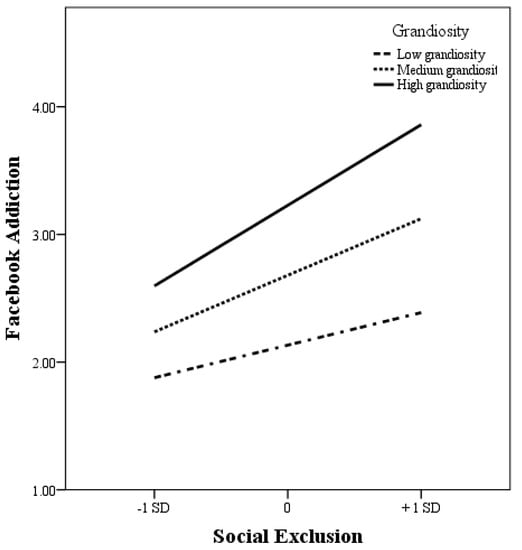 2.5. Moderating Effects of Grandiosity on Social Exclusion and Facebook Addiction