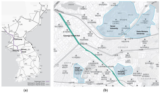 (a) Rail road system of Korea; (b) Gyeongui Line Forest Park.