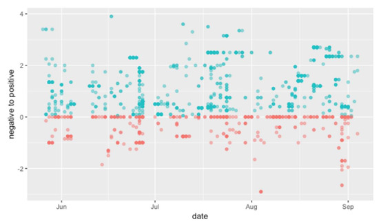 As mentioned in Section 2, the sentiment analysis of social media data provides insight into the users’ attitude toward the park. The results indicate that more users had a positive experience than those who had a negative one (Figure 3). Figure 3 shows the number of tweets and sentiment scores of each tweet during the study period. The results show that social media users generally reacted positively when they posted about the park. This also supports the previous study that social media users tend to highlight their positive attributes [86].