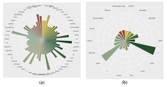 The negative sentiments were more complex in real-life than the positive sentiments, since the result of the frequency analysis indicated that the number of users who mentioned a word was too low to draw any conclusions. In other words, each word was mentioned 20 times. Only some words such as ‘park’, ‘it’, ‘I’, and ‘people’ were mentioned over 20 times in the negative dataset. Other words that were mentioned between 10 to 20 times were ‘disease’, ‘tsutsugamushi (disease from lawn)’, and ‘ghastly’. All three words were related to the disease from the lawn. This data show that park visitors worried about the disease when they visited the park (Figure 4b).