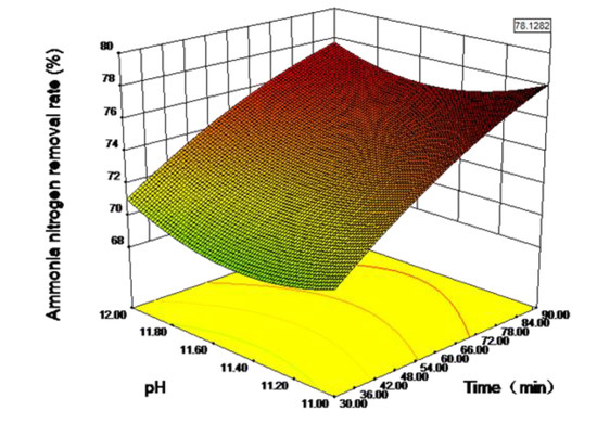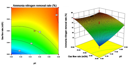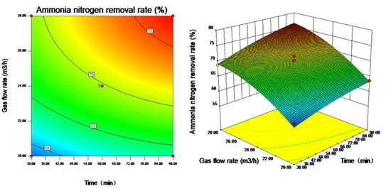 As shown in Figure 5, the interaction between stripping time and pH value is not significant (p > 0.05), and the ammonia nitrogen removal rate is quite sensitive to changes in stripping time. When the stripping time and pH value are at high levels, the ammonia nitrogen removal rate is large. When the stripping time is 90 min and the pH value is approximately 12, the ammonia nitrogen removal rate is large. As shown in Figure 6, the interaction between stripping time and gas flow rate is not significant (p > 0.05), and the ammonia nitrogen removal rate is quite sensitive to changes in gas flow rate. When the stripping time and gas flow rate are at high levels, the ammonia nitrogen removal rate is large. When the stripping time is 90 min and the gas flow rate is approximately 28 m3/h, the ammonia nitrogen removal rate is large. As shown in Figure 7, the interaction between pH value and gas flow rate is significant (p < 0.05). When the gas flow rate is approximately 28 m3/h and the pH values are approximately 11 and 12, the ammonia nitrogen removal rate is large.