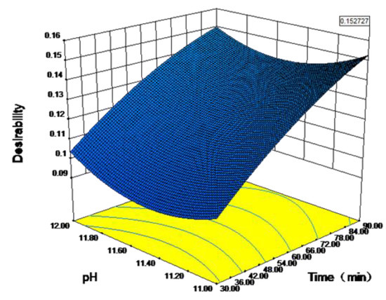 The satisfaction function method is also known as the desirability function method. Proposed by Harrington in the 1960s, this method turns each response into an individual satisfaction value and then determines the overall satisfaction in the interval (0,1), which is convenient for quickly finding the optimal solution to a problem [24,25]. The feasibility of the satisfaction function method can be enhanced by applying the weighted geometric mean method of Derringer and Suich [26]. The optimal ammonia nitrogen removal rate has been estimated according to response surface methodology. As shown in Figure 8, when the stripping time is 90 min, the pH value is 11 and the gas flow rate is 28 m3/h, the maximum value for the corresponding response value is 78.13%. As shown in Figure 9, the reliability of the satisfaction function of the optimized combined parameters is 0.153, indicating that the optimized function can represent the test model and required conditions [11].