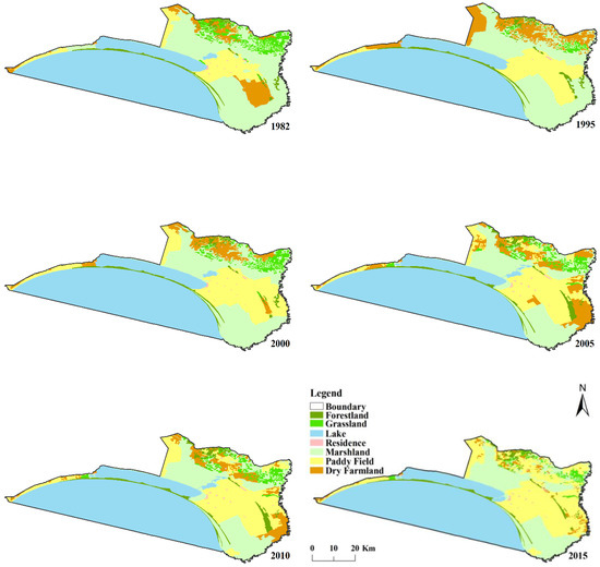 We measured the spatial distribution and area ratios of marshlands, paddy fields, and dry farmlands for the years 1982, 1995, 2000, 2005, 2010, and 2015. Marshlands occupied 787.2 km2 (30.42%) of the total study area in 1982 (Figure 1).