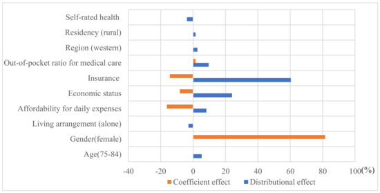 Distributional changes in age, living arrangements, affordability for daily expenses, self-rated economic status, residency and regional location, insurance coverage, out-of-pocket payment ratio for medical care, and self-rated health made a significant contribution to the change in perceived accessibility (Table 3). The distributional effects on the improvement of perceived accessibility were mainly attributable to increased insurance coverage (60.36%), reduction in self-rated poor economic status (24.05%), reduced out-of-pocket payment ratio for medical care (9.58%), and improved affordability for daily expenses (8.24%) (Figure 1).