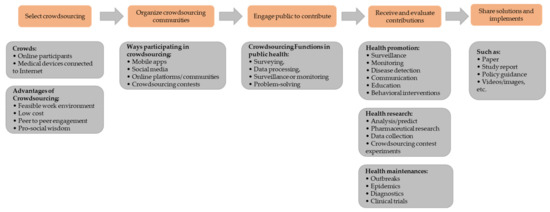 With 4.02 billion Internet users and 5.14 billion unique mobile subscribers [], online platforms and mobile apps for crowdsourcing have been developed to improve public health [], particularly in tracking diet and exercise, aiding smokers’ cessation, preventing binge drinking, and disseminating health communication, etc. Public health commits to improving the quality of life by preventing and treating diseases and, nowadays, many subfields of public health have drawn scholars’ attention, such as community health, behavioral health, mental health, occupational safety, gender issues in health, and sexual health [,,]. Harrison C et al. used crowdsourcing to predict unreported outbreaks and foodborne illnesses based on the business review website Yelp []. Wilson J et al. conducted an online survey of US adults about their perceptions of chiropractors to test the feasibility of using the Amazon Mechanical Turk (MTurk) []. Crowdsourcing contests provide an opportunity for online citizens to participate in public engagement. For example, a competition was organized to draw public attention to heart disease by mapping the locations of automated external defibrillators []. Another contest experiment was that Joseph D et al. asked participants to design and upload videos to raise awareness about condom use and HIV testing in China [,]. In modern public health science, it may require multidisciplinary scientists to collaborate on problem-solving, data surveys, collection, and processing. Brabham described a framework for crowdsourcing adoption in public health from a four-type typology: knowledge discovery and management, distributed human intelligence tasking, broadcast search, and peer-vetted creative production [].