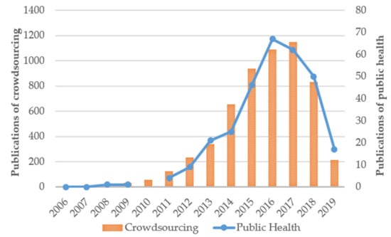 Numbers of publications related to crowdsourcing and crowdsourcing research in the field of public health in the WOS core collection, published from 2006 to 2019.
