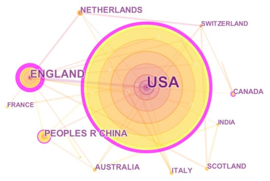 Citespace V can use annual rings to display the number of papers published by countries, cooperation and centrality. The size of the annual rings serves as the quantity of posts, and the outermost purple circle shows the centrality []. We select country and institution as network nodes respectively, with the data extraction object of Top 30, and the path data is visualized by pathfinder.