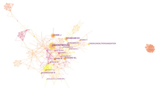 The author collaboration network of crowdsourcing research was described in Figure 4. The significance of Anonymous (63), Howe (40), Brabham (35), Ranard (32) and Swan (27) can be clearly appreciated. On the report of figure information, Anonymous has produced the most papers regarding to crowdsourcing applied in public health. Hence, we list the top 10 authors and co-authors with the most articles contributed by a worth of 298 authors in Table 3. The Hirsch index, or h-index, and citations have been included for each scientist. Looking at Figure 3 and Table 3, we find that Cooper (centrality = 0.21) and Gao (centrality = 0.2) are two authors with a high degree of cooperation in this field. Tucker (10), Tang (8), Zhang (7) are the top three authors with productive publications. In terms of co-citations, Mason has been cited the highest due to having the most indicators for the number of citations. However, Howe is the core co-author on crowdsourcing applications for public health.