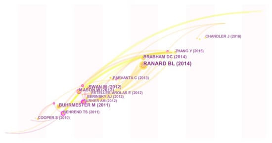 Based on co-cited references, CiteSpace V can generate a research evolution graph to display the development of crowdsourcing applications in public health with a time zone version. We selected cited references as the network node and adopted the path search algorithm (pathfinder) to analyze []. Therefore, we can identify key research results on this topic, as seen in Figure 6. These scholars and their research results have played important roles in promoting the development of crowdsourcing research in the field of public health.