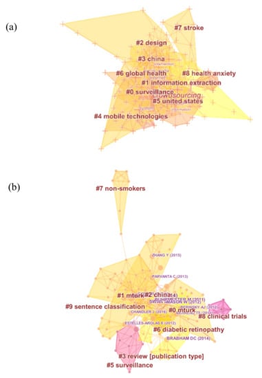 In Figure 7a, the largest cluster #0 is labeled as “surveillance”, following by cluster #1 “information extraction”, cluster #2 “design”, cluster #3 “China”, cluster #4 “mobile technologies”, cluster #5 “United States”, cluster #6 “global health”, cluster #7 “stroke”, and cluster #8 “health anxiety”. In Figure 7b, there are 10 clusters from large to small: cluster #0 “mturk”, cluster #1 “mturk”, cluster #2 “China”, cluster #3 “review”, cluster #5 “surveillance”, cluster #6“diabetic”, cluster #7 “non-smokers”, cluster #8 “clinical trials”, and cluster #9“sentence classification”.