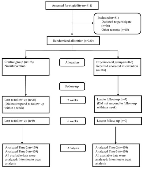 The study participants were patients aged 20–45 years with PD at a dental clinic in Kaohsiung City in Southern Taiwan. Patients who registered in the Comprehensive Periodontal Treatment Project (CPTP) over the past three months were recruited. The CPTP is fully supported by the Taiwan National Health Insurance for the additional 20% expense of treatment fees in patients with moderate to severe periodontitis and require comprehensive treatment. According to an a priori sample size estimation, 150 participants per group could provide 80% power (beta) and 5% significance (alpha) for detecting a 0.5 effect size (ES). We recruited a total of 165 patients each in the experimental group (EG) and control group (CG). In total, 158 (95.8%) and 139 (84.2%) patients in the EG and CG, respectively, completed the study at all time points.