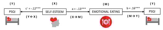 Mediation models on the involvement of psychological variables in the relationship between self-esteem and sleep quality confirmed our hypothesis. First, low self-esteem is associated with the emotional intake derived from the anxiety and stress to which they are subjected [9,29], leading to an uncontrolled intake of junk food that consequently causes sleep disturbances [28]. On the other hand, low self-esteem is related to poor sleep quality, increasing their vulnerability, affecting their work performance, and reducing the quality of patient care [29].