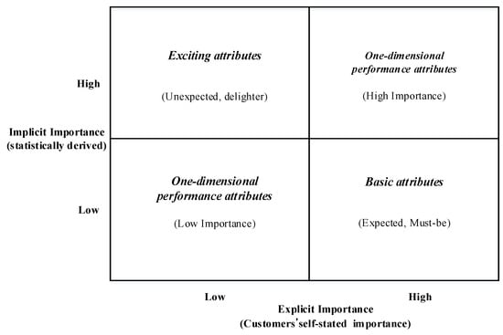 Vavra [] firstly proposed that the importance grid could be used to identify the three satisfaction factors (basic attributes, excitement attributes, and performance attributes). Importance grid is constructed depending on whether the importance of attribute is derived explicitly or implicitly. A customer’s self-stated importance is identified as explicit importance. It is the indicator of an attribute’s dissatisfaction-generating potential. Different from explicit importance, as an indicator of satisfaction-generating potential, implicit importance is obtained indirectly such as applying regressing attribute-level performance against overall satisfaction [,,,].