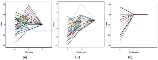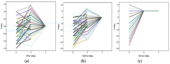 Utility plot of attributes in Dalishu scenic spots ((a) utility change with price rating; (b) utility change with activity rating; (c) utility change with service rating).