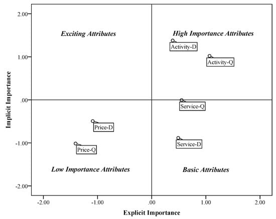 Grand means of explicit and implicit attribute importance are used as the axis of the plot. Attributes are then plotted in the grid (Figure 5). The “service” attribute that has high explicit and low implicit importance is categorized as the basic attribute of overall customer satisfaction. “Price”, which has low explicit and implicit importance, is considered a low important attribute. On the contrary, “activity”, which has high explicit importance and high importance, is categorized as a high importance attribute.