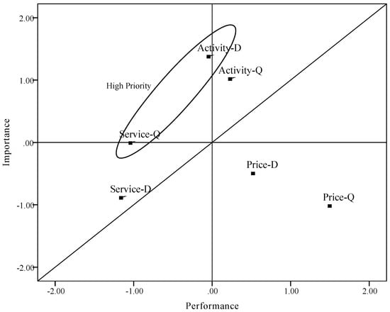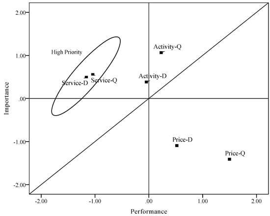 Considering the importance grid analysis results, “rural tourism service” is categorized as a basic attribute. It means that this attribute has an impact on the overall satisfaction when it is unmet, although it will not enhance its satisfaction when the needs are exceeded. For this reason, Figure 7 seems to have similar plot of attributes with the revised IPA grid. However, according to results of conjoint analysis and the importance grid, the importance of service in these two tourism sites is less than the activity. As a basic attribute, it is more accurately plotted in the third area of the IPA grid.